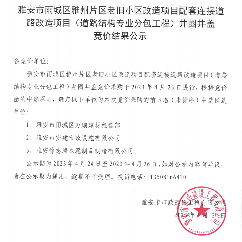 雅安市雨城區(qū)雅州片區(qū)老舊小區(qū)改造項(xiàng)目配套連接道路改造項(xiàng)目(道路結(jié)構(gòu)專業(yè)分包工程)井圈井蓋競(jìng)價(jià)結(jié)果公示