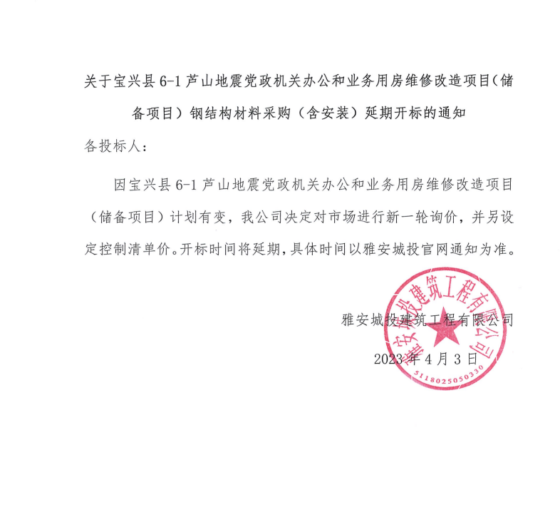 關(guān)于寶興縣6-1蘆山地震黨政機(jī)關(guān)辦公和業(yè)務(wù)用房維修改造項目(儲備項目)鋼結(jié)構(gòu)材料采購(含安裝)延期開標(biāo)的通知