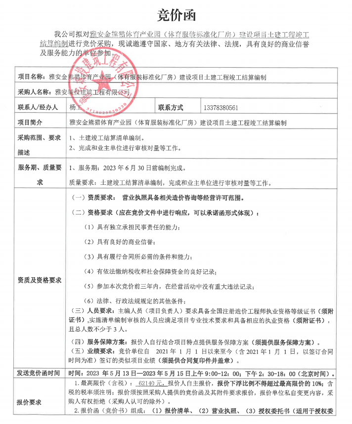雅安金熊貓體育產(chǎn)業(yè)園(體育服裝標(biāo)準(zhǔn)化廠房)建設(shè)項目土建工程竣工結(jié)算編制競價公告