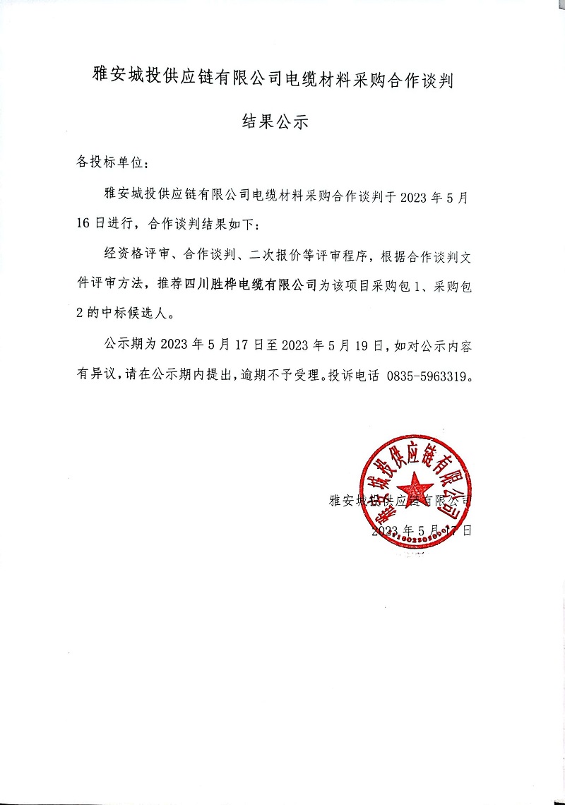 雅安城投供應(yīng)鏈有限公司電纜材料采購(gòu)合作談判結(jié)果公示