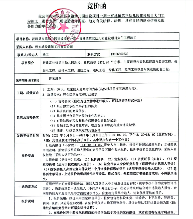 漢源縣鄉(xiāng)鎮(zhèn)幼兒園建設(shè)項目一期一富林鎮(zhèn)第三幼兒園建設(shè)項目大門工程施工競價公告