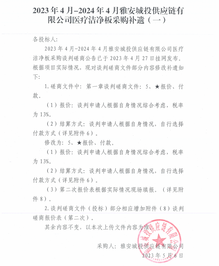 2023年4月-2024年4月雅安城投供應鏈有限公司醫(yī)療潔凈板采購補遺(一)