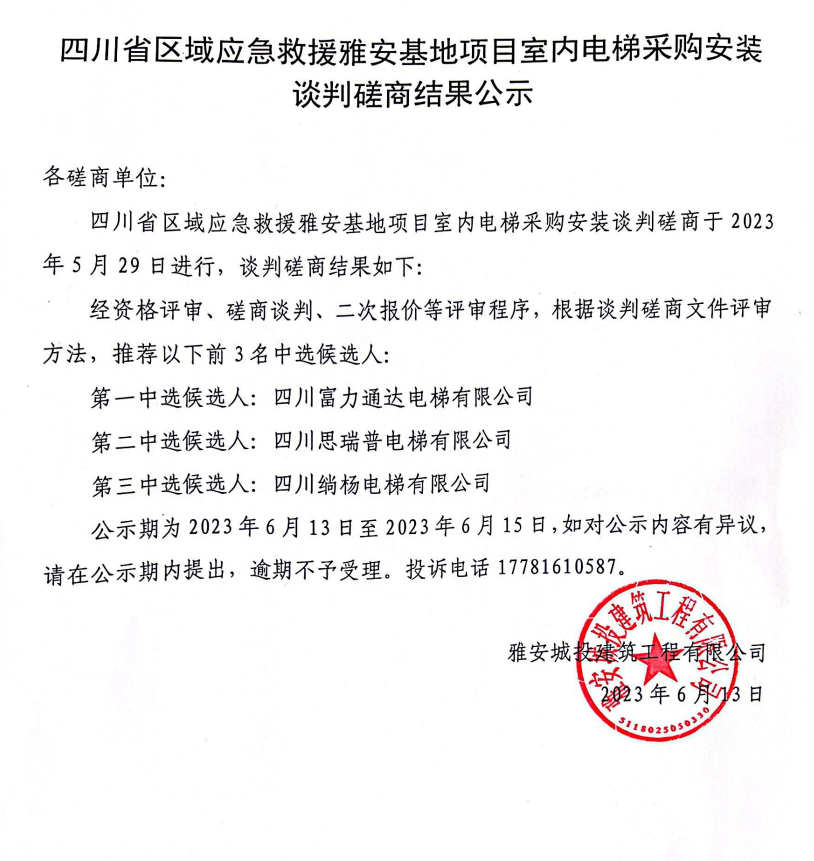 四川省區(qū)域應(yīng)急救援雅安基地項目室內(nèi)電梯采購安裝談判磋商結(jié)果公示