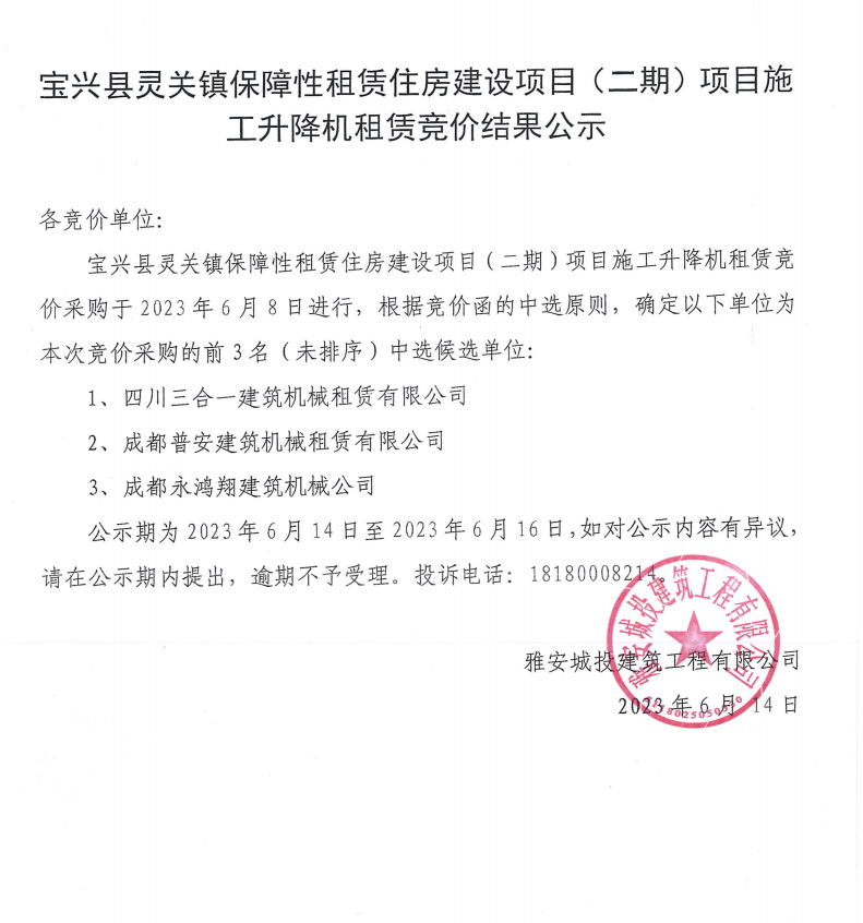 寶興縣靈關鎮(zhèn)保障性租賃住房建設項目(二期)項目施工升降機租賃競價結果公示