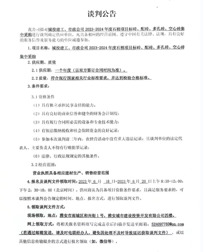 城投建工、市政公司2023-2024年度石棉項(xiàng)目標(biāo)磚、配磚、多孔磚、空心磚集中采購(gòu)談判公告