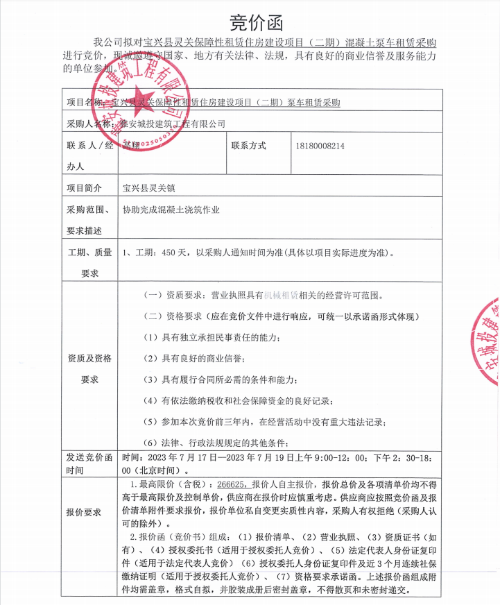 寶興縣靈關(guān)保障性租賃住房建設(shè)項(xiàng)目(二期)混凝土泵車(chē)租賃采購(gòu)競(jìng)價(jià)公告