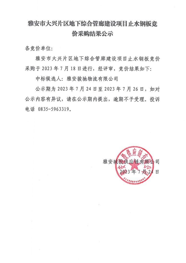 雅安市大興片區(qū)地下綜合管廊建設項目止水鋼板競價采購結(jié)果公示