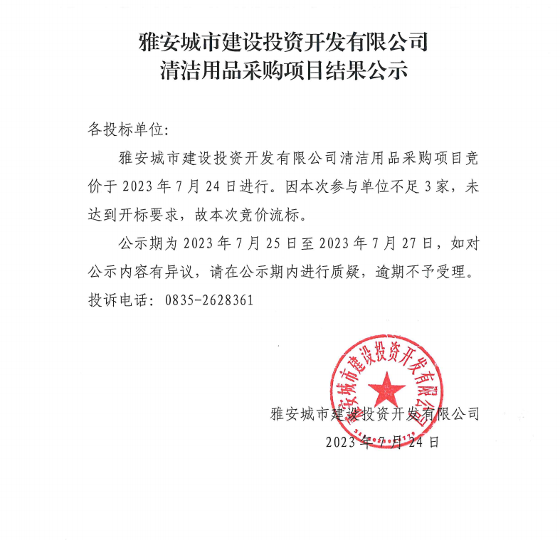 雅安城市建設投資開發(fā)有限公司清潔用品采購項目結(jié)果公示