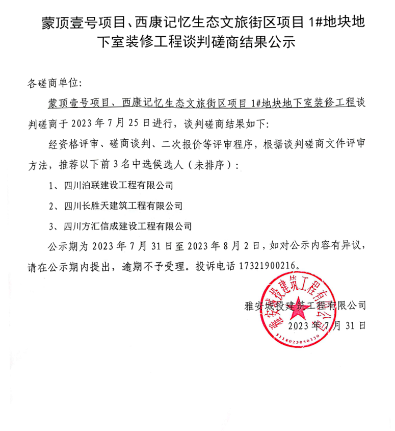 蒙頂壹號項目、西康記憶生態(tài)文旅街區(qū)項目1#地塊地下室裝修工程談判磋商結果公示