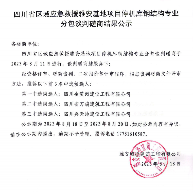 四川省區(qū)域應(yīng)急救援雅安基地項目停機庫鋼結(jié)構(gòu)專業(yè)分包談判磋商結(jié)果公示