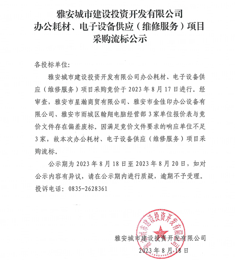 雅安城市建設(shè)投資開(kāi)發(fā)有限公司辦公耗材、電子設(shè)備供應(yīng)(維修服務(wù))項(xiàng)目采購(gòu)流標(biāo)公示