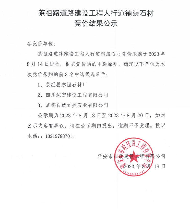 茶祖路道路建設(shè)工程人行道鋪裝石材競價結(jié)果公示