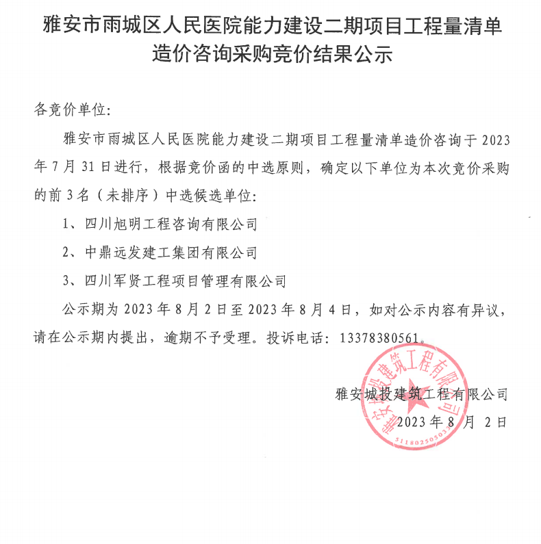 雅安市雨城區(qū)人民醫(yī)院能力建設(shè)二期項目工程量清單造價咨詢采購競價結(jié)果公示
