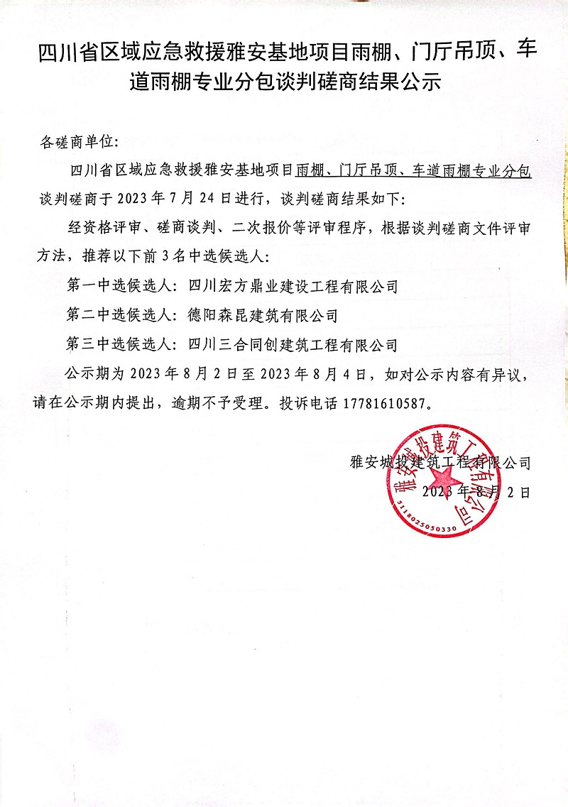 四川省區(qū)域應(yīng)急救援雅安基地項目雨棚、門廳吊頂、車道雨棚專業(yè)分包談判磋商結(jié)果公示
