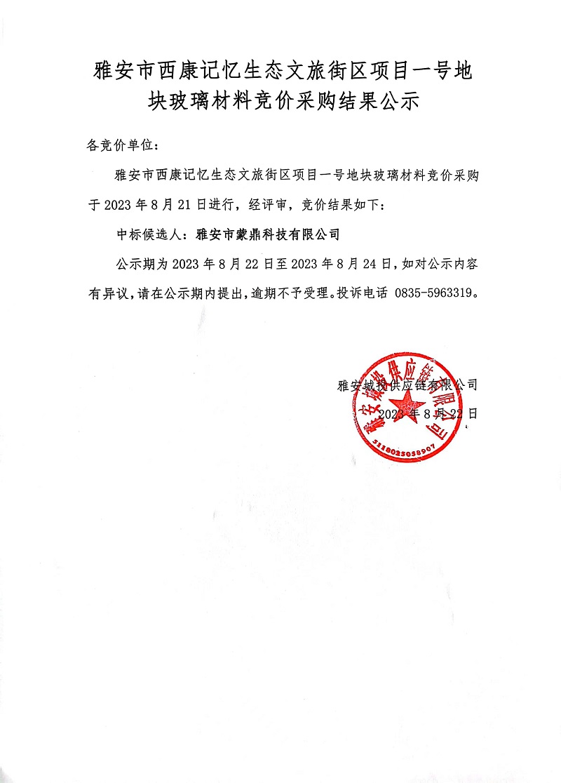 雅安市西康記憶生態(tài)文旅街區(qū)項目一號地塊玻璃材料競價采購結(jié)果公示