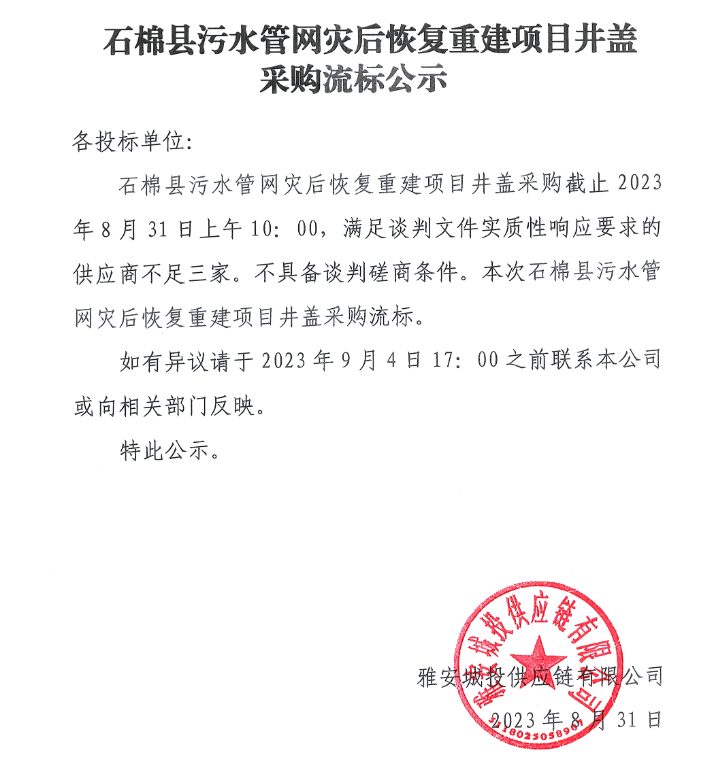 石棉縣污水管網(wǎng)災(zāi)后恢復(fù)重建項(xiàng)目井蓋采購流標(biāo)公示