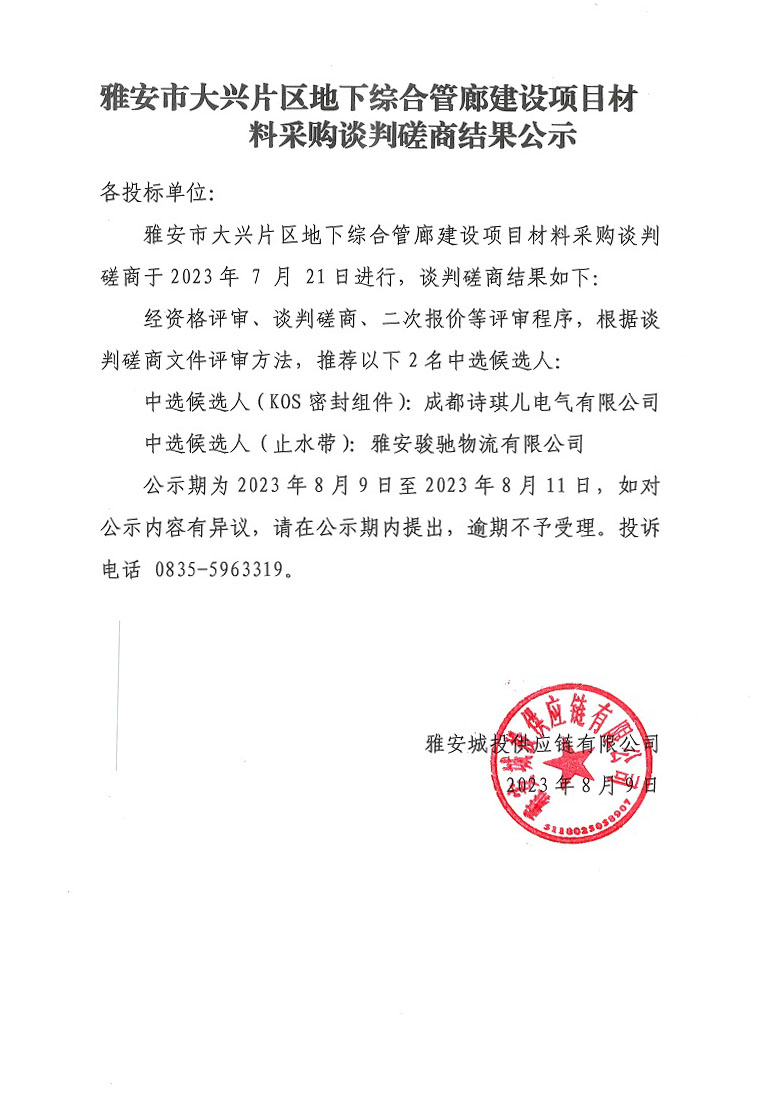 雅安市大興片區(qū)地下綜合管廊建設(shè)項(xiàng)目材料采購談判磋商結(jié)果公示