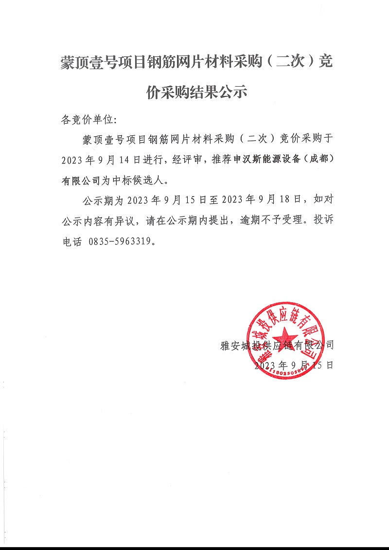 蒙頂壹號項(xiàng)目鋼筋網(wǎng)片材料采購(二次)競價(jià)采購結(jié)果公示