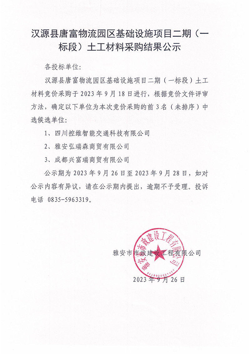 漢源縣唐富物流園區(qū)基礎(chǔ)設(shè)施項目二期(一標(biāo)段)土工材料采購結(jié)果公示