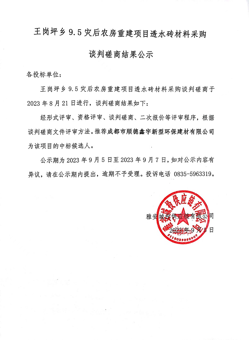 王崗坪鄉(xiāng)9.5災(zāi)后農(nóng)房重建項目透水磚材料采購談判磋商結(jié)果公示