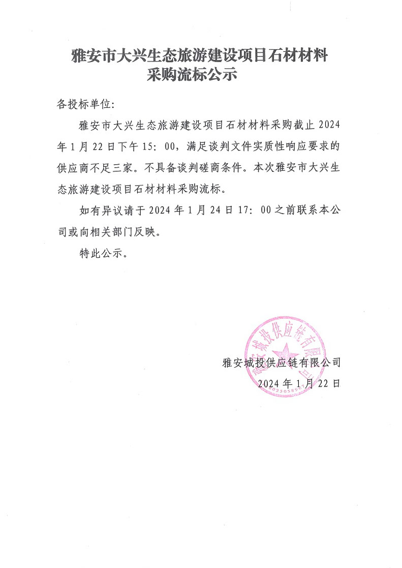 雅安市大興生態(tài)旅游建設(shè)項目石材材料采購流標(biāo)公示