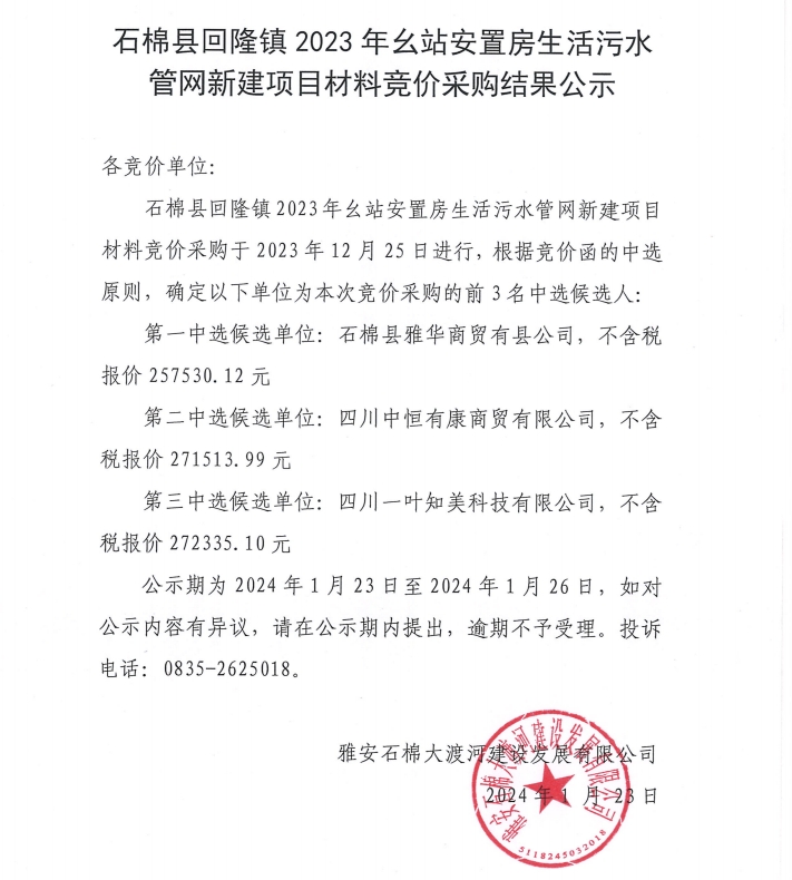 石棉縣回隆鎮(zhèn)2023年幺站安置房生活污水管網(wǎng)新建項(xiàng)目材料競(jìng)價(jià)采購(gòu)結(jié)果公示