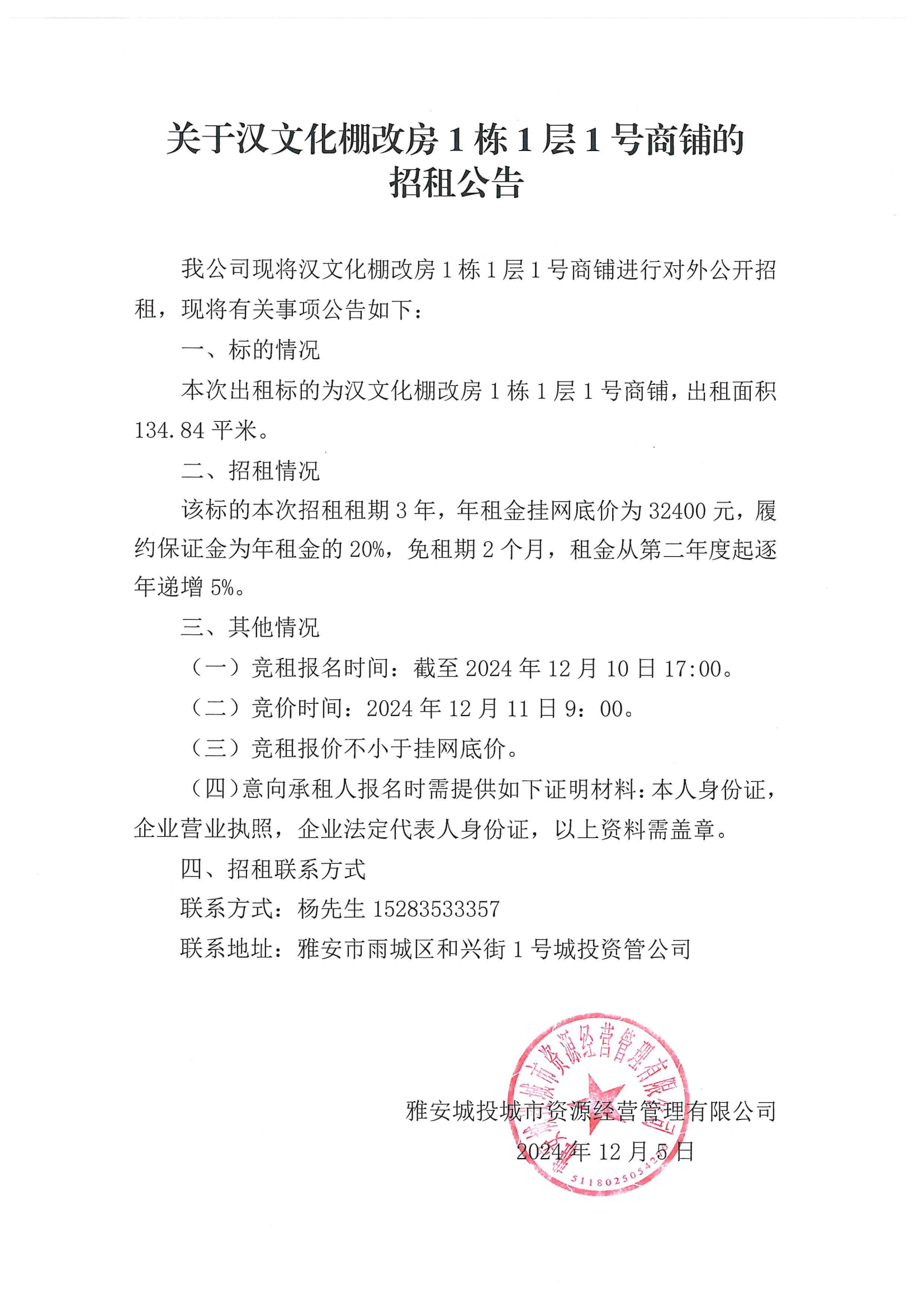 關于漢文化棚改房1棟1層1號商鋪招租公告