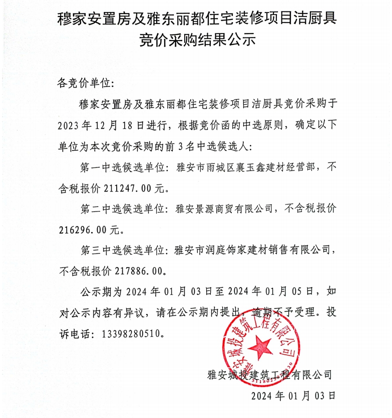 穆家安置房及雅東麗都住宅裝修項目潔廚具競價采購結(jié)果公示
