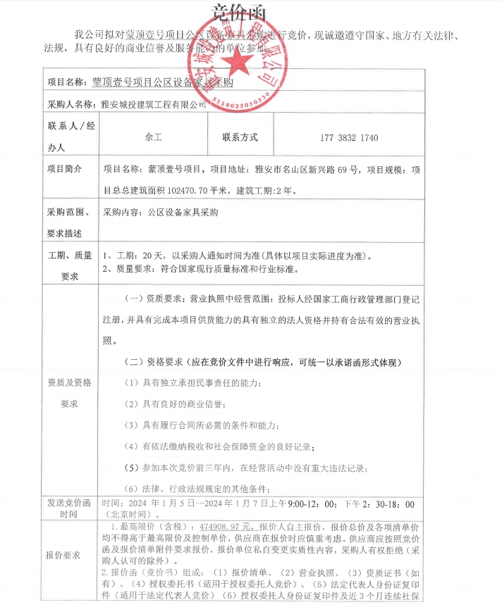 蒙頂壹號(hào)項(xiàng)目公區(qū)設(shè)備家具采購(gòu)競(jìng)價(jià)公告