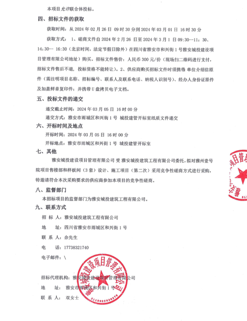 雅州壹號院項目售樓部和樣板間(3套)設計、施工項目(第二次)公告