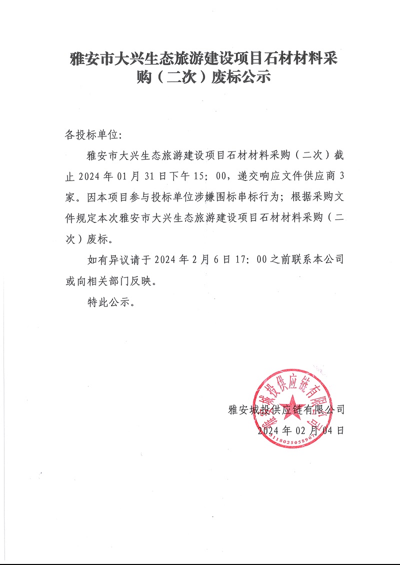 雅安市大興生態(tài)旅游建設(shè)項(xiàng)目石材材料采購(gòu)(二次)廢標(biāo)公示