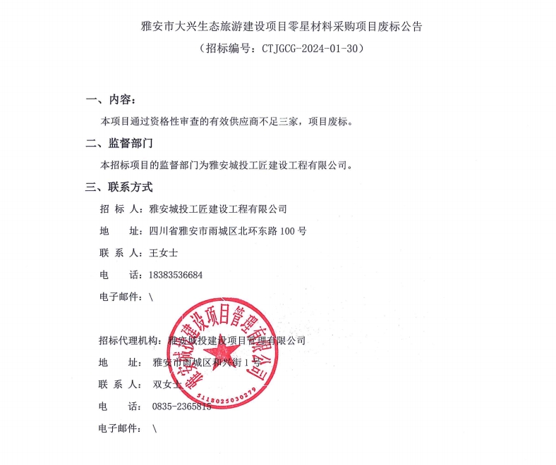 雅安市大興生態(tài)旅游建設(shè)項(xiàng)目零星材料采購(gòu)項(xiàng)目廢標(biāo)公告