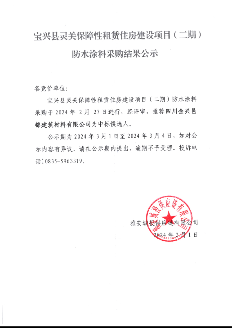 寶興縣靈關保障性租賃住房建設項目(二期)防水涂料采購結果公示