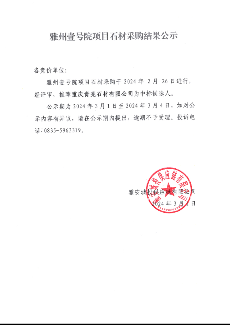 雅州壹號院項目石材采購結(jié)果公示
