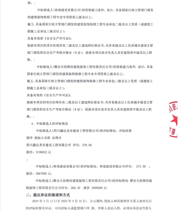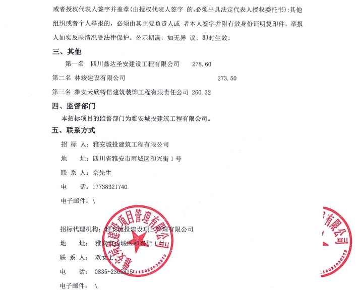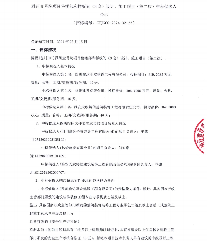 雅州壹號院項目售樓部和樣板間(3套)設(shè)計、施工項目(第二次)中標候選人公示
