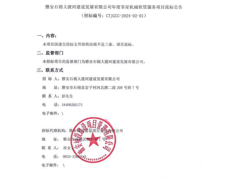 雅安石棉大渡河建設(shè)發(fā)展有限公司年度零星機械租賃服務(wù)項目流標公告
