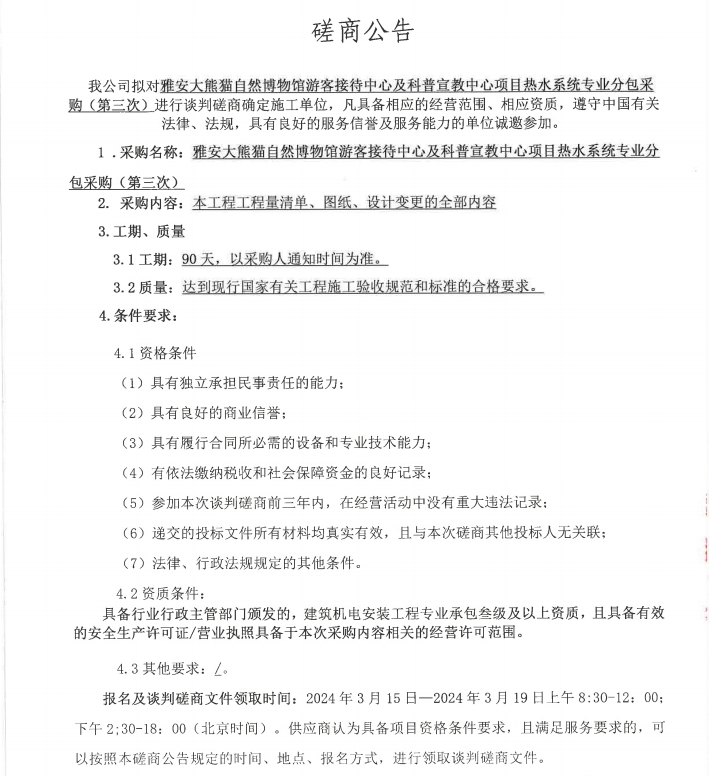 雅安大熊貓自然博物館游客接待中心及科普宣教中心項(xiàng)目熱水系統(tǒng)專(zhuān)業(yè)分包采購(gòu)(第三次)磋商公告