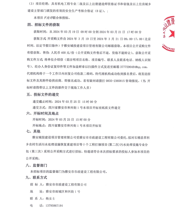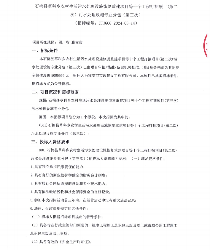石棉縣草科鄉(xiāng)農(nóng)村生活污水處理設(shè)施恢復(fù)重建項(xiàng)目等十個(gè)工程打捆項(xiàng)目(第二次)污水處理設(shè)施專(zhuān)業(yè)分包(第三次)公告