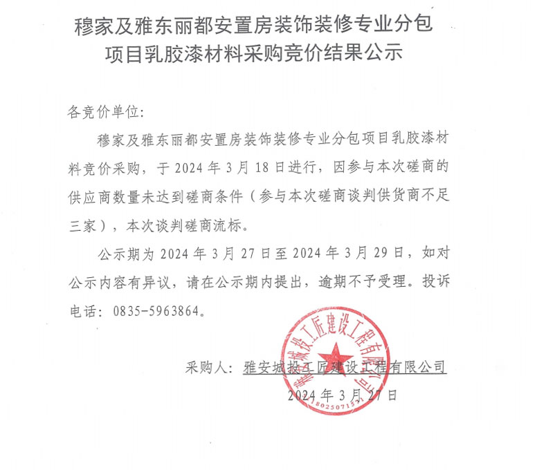 穆家及雅東麗都安置房裝飾裝修專業(yè)分包項目乳膠漆材料采購競價結(jié)果公示