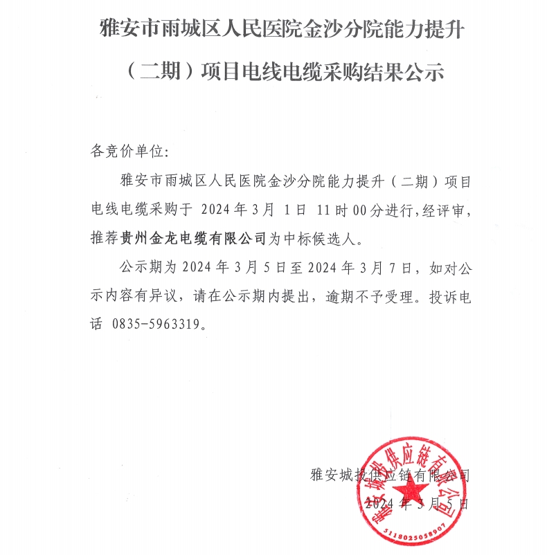 雅安市雨城區(qū)人民醫(yī)院金沙分院能力提升(二期)項(xiàng)目電線電纜采購結(jié)果公示