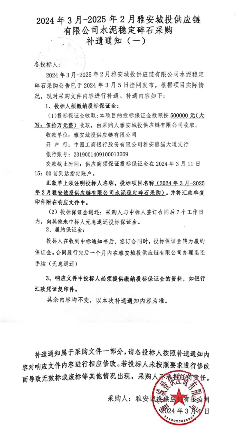 2024年3月-2025年2月雅安城投供應(yīng)鏈有限公司水泥穩(wěn)定碎石采購(gòu)補(bǔ)遺通知(一)
