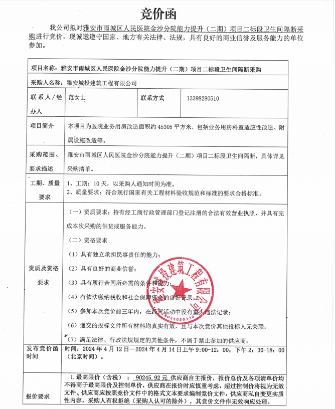 雅安市雨城區(qū)人民醫(yī)院金沙分院能力提升(二期)項(xiàng)目二標(biāo)段衛(wèi)生間隔斷采購(gòu)競(jìng)價(jià)公告