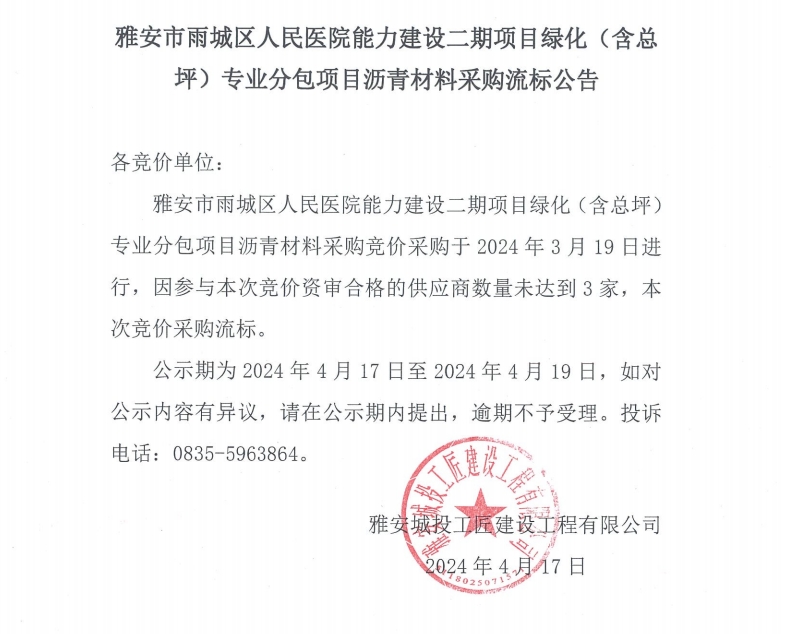 雅安市雨城區(qū)人民醫(yī)院能力建設(shè)二期項(xiàng)目綠化(含總坪)專業(yè)分包項(xiàng)目瀝青材料采購流標(biāo)公告