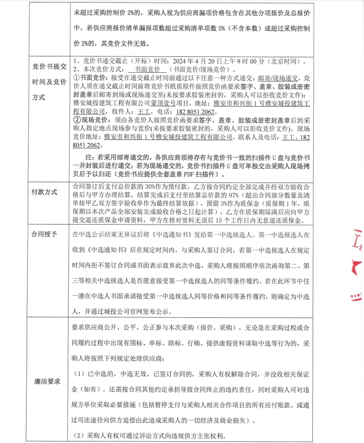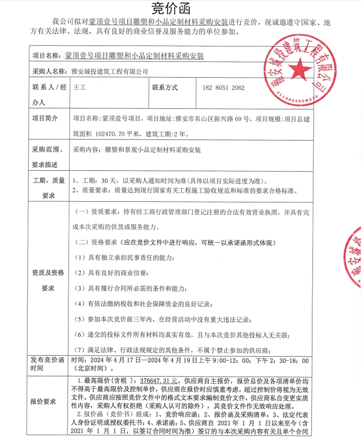 蒙頂壹號項目雕塑和小品定制材料采購安裝競價公告