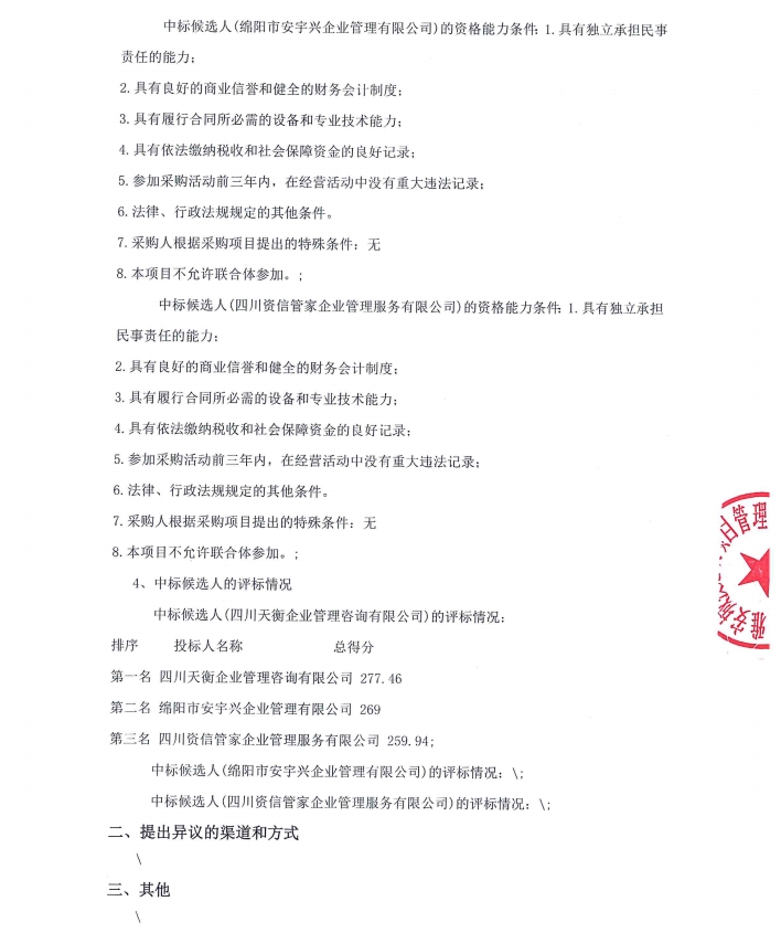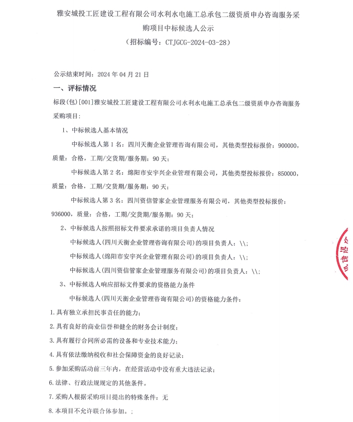雅安城投工匠建設工程有限公司水利水電施工總承包二級資質(zhì)申辦咨詢服務采購項目中標候選人公示