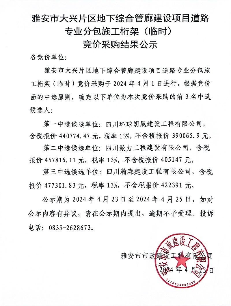 雅安市大興片區(qū)地下綜合管廊建設(shè)項目道路專業(yè)分包施工桁架(臨時)競價采購結(jié)果公示