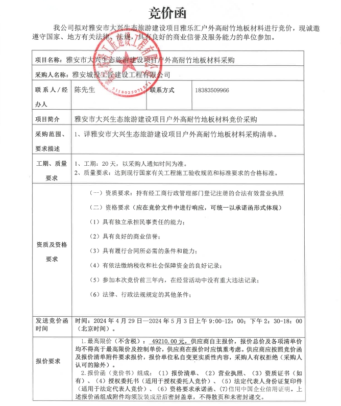雅安市大興生態(tài)旅游建設(shè)項(xiàng)目霽雨橋、木棧道戶(hù)外高耐竹地板材料采購(gòu)競(jìng)價(jià)公告