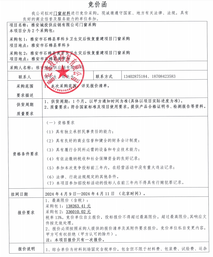雅安城投供應(yīng)鏈有限公司門窗采購競價公告
