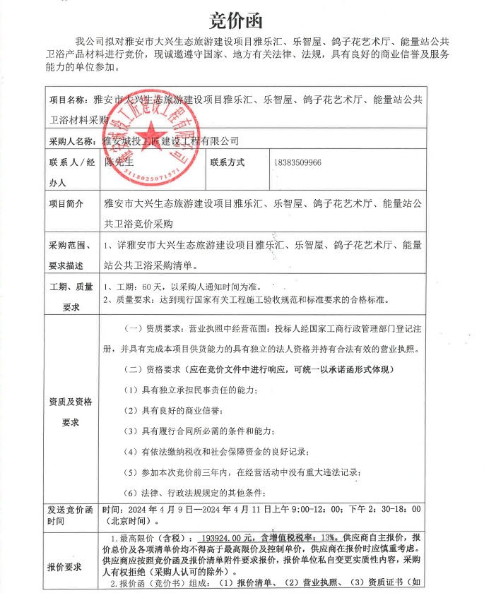 雅安市大興生態(tài)旅游建設(shè)項(xiàng)目雅樂匯、樂智屋、鴿子花藝術(shù)廳、能量站公共衛(wèi)浴材料采購競(jìng)價(jià)公告
