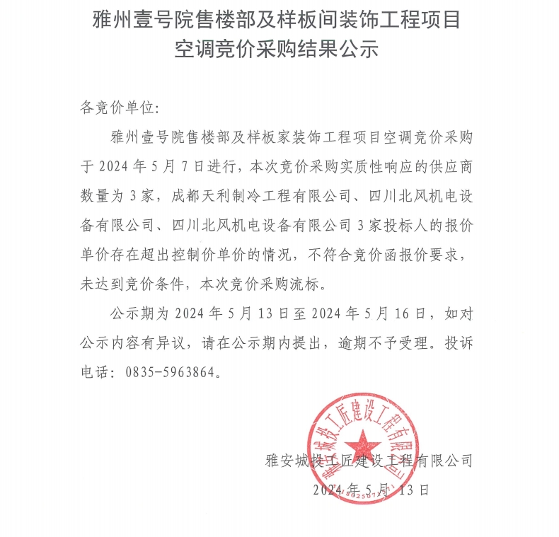 雅州壹號院售樓部及樣板間裝飾工程空調競價采購結果公示